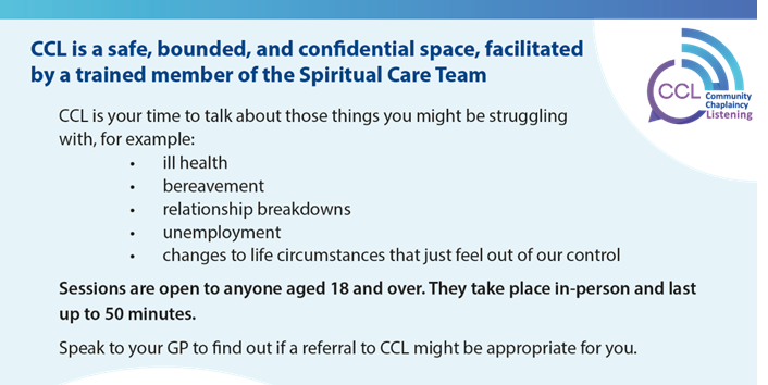 As of the 23rd of July 2025, the Community Chaplaincy Listening Service is back at Crown Medical Practice. Sessions will be held on Wednesday mornings once a fortnight.